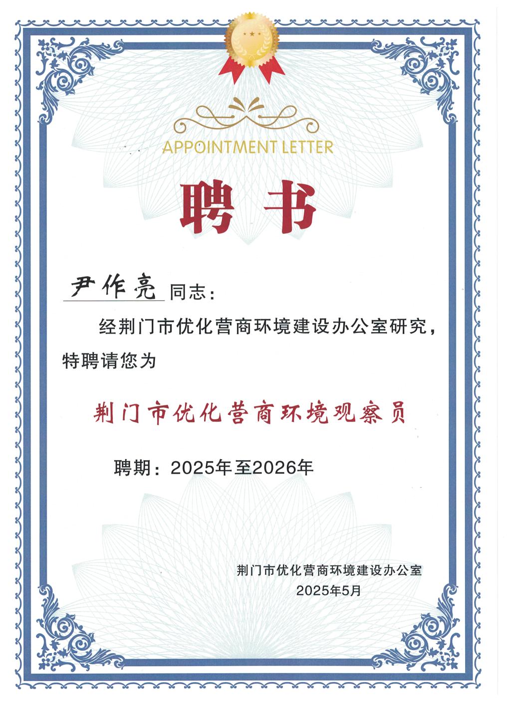 尹作亮教授获聘为荆门市优化营商环境观察员